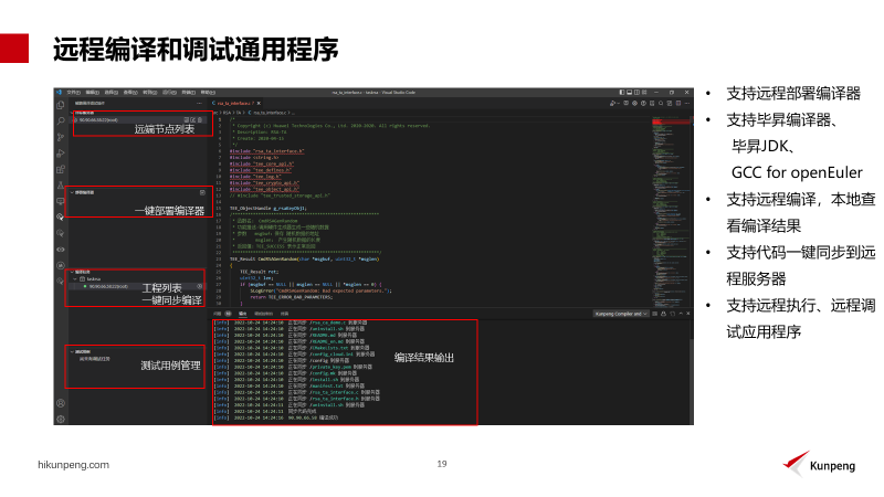 这个过程相对来说是比较低效,为解决因开发编译调试环境分离,造成的开发效率低下问题,鲲鹏亲和开发框架提供了鲲鹏编译调试功能,该功能可以简化程序开发流程,提高开发效率,可以在本地IDE中实现开发同步、代码远程编译和远程调试功能。