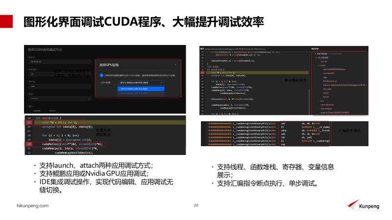 鲲鹏亲和开发框架提供的编译调试插件,在原有功能上增加了CUDA程序调试器。可以在本地ID上调试,远程服务器上的CUDA应用程序。通过图形化页面的方式向用户提供CUDA程序调试能力,功能更加贴近开发习惯,简单易用,降低了用户的使用门槛和学习成本,提升了代码调试效率。
