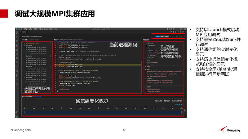 接下来介绍是一个重点功能。编译调试针对大规模MPI应用集群的调试能力,目前现状是:HPC并行程序具有复杂逻辑、并发量大、计算节点多、进程数多、状态切换迅速且复杂等特点,难以进行一个集群调试。针对这个问题,鲲鹏调试器提供HPC并行调试功能,支持launch模式启动,最多支持256个本地或远程的MPI集群应用进行调试。