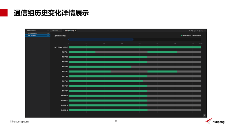 可以看到通信组变化界面,鲲鹏调试器支持通信组生命周期的展示。当开发者点开详情页面后,鲲鹏调试器会在时间轴上展示每一个通信组程序时间段,方便用户了解对应时间段执行通信组的情况,帮助开发者去更好的定位问题,提高调试效率。