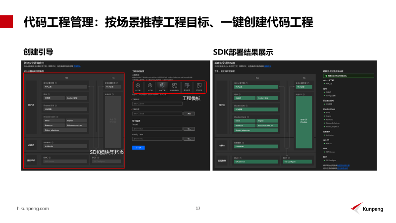 鲲鹏开发框架向开发者展示SDK模块架构图,可以清晰了解到所需要组件以及在系统中位置,选择自动部署或者下载后手动部署SDK到远程服务器,用户可以根据组件架构图的提示,查看部署是否完成。