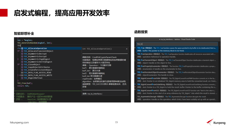• 开发过程中,通过启发式编程,可以智能提示近万条优化函数和百万级依赖文件。