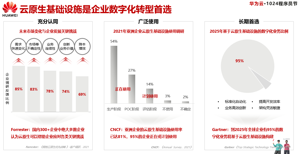 据Forerester对国内三百多个企业的调研结果显示,企业充分认同未来市场变化和企业发展的五大关键挑战包括:需求快速变化、市场不确定性、业务连续性、创新业务价值、将本增效,其中让企业领导者最担忧的是需求的快速变化,这就要求企业未来的技术架构必须能够满足敏捷交付、快速弹性这些特性,以适应需求和市场的变化。CNCF的亚洲企业和云原基础设施使用率调研结果显示云原生已在企业内被广泛使用,超过54%的企业正在使用云原生基础设施,14%的企业计划使用。Gartner预测,到2025年超过95%的的数字化业务将基于云原生基础设施构建,可以看出云原生在未来仍然有较大的增长空间,云原生基础设施是企业数字化转型的长期首选。