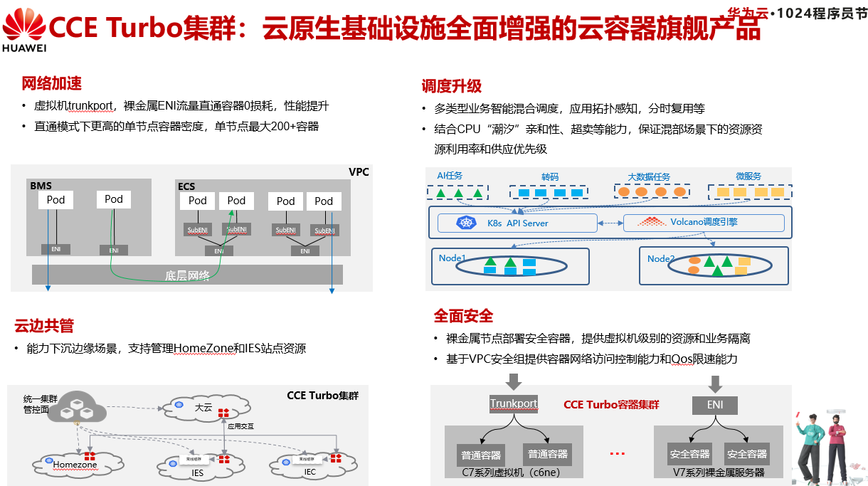 首先让我们看一下CCE Turbo。从名字上看,CCE Turbo是CCE的加强版,它主要在计算、网络、调度和安全几个方面对CCE做了增强。