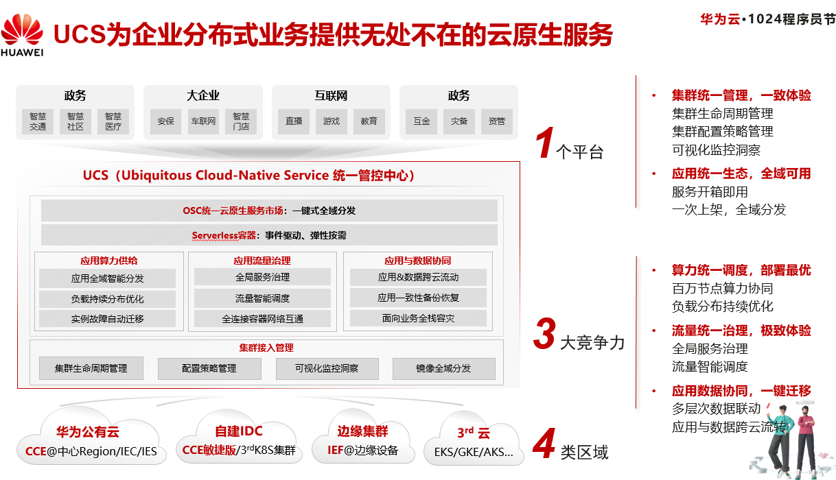 UCS的全称是Ubiquitous Cloud-Native Service,是华为云2021年重磅发布的一个服务。要理解UCS可以把它拆成两部分:分布式云和云原生,大家对云原生可能已经耳熟能详,但是分布式云是最近两年才起来的概念。何为分布式云?分布式云指的是将公有云服务(通常包括必要的硬件和软件)分布到不同的物理位置(即边缘),而服务的所有权、运营、治理、更新和发展仍然由原始公有云提供商负责,这也意味着,公有云由原来的几朵“大云”,转变为“大云”加“小云”的分布模式。分布式云解决了因地理空间所造成的“硬件”难题,云原生则是从业务视角出发,解决企业应用云计算的“软件”难题。