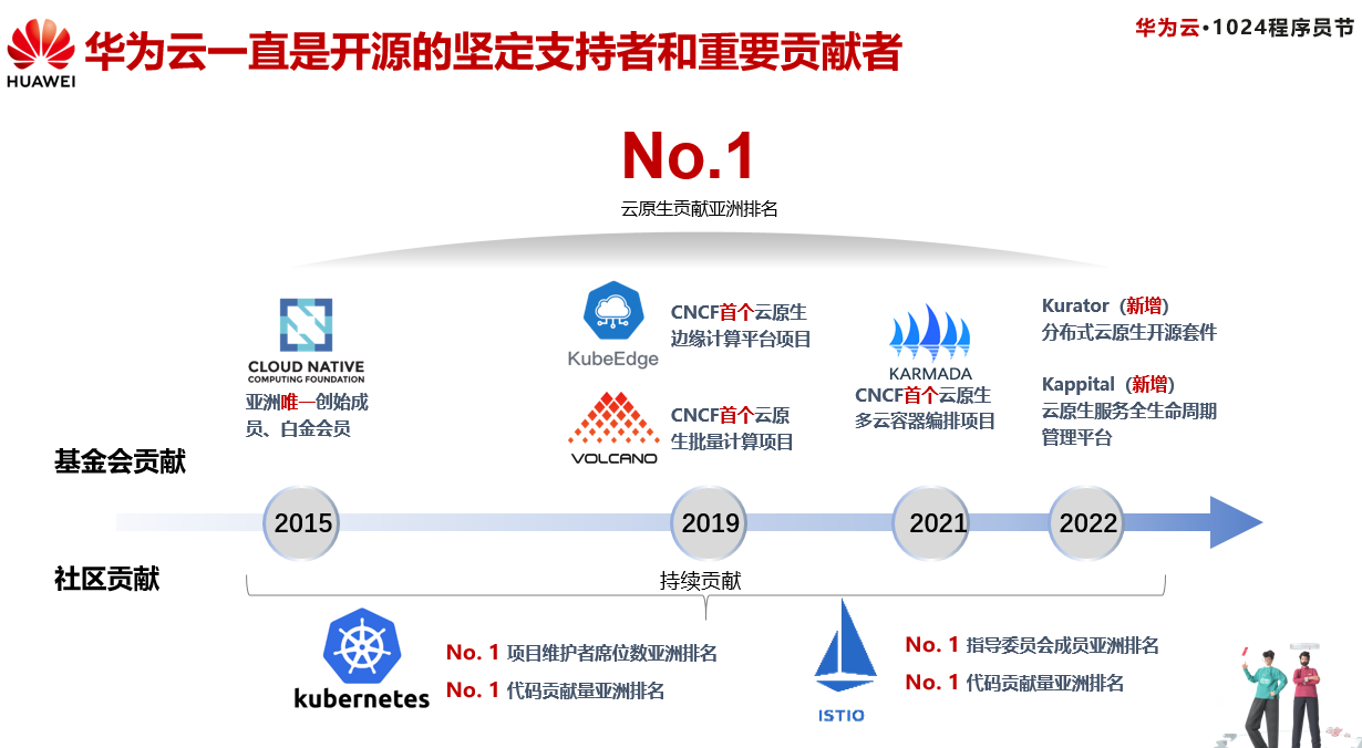 在基金会贡献方面,CNCF基金会2015年成立伊始,华为云便成为基金会亚洲唯一创始成员、白金会员,一直到今年,华为云已向CNCF贡献多个首创开源项目,包括云原生边缘计算平台项目KubeEdge,云原生批量计算项目Volcano,云原生多云容器编排项目Karmada,今年,华为云又开源了两个云原生领域的项目Kurator和Kappital,收到广大开发者的追捧。