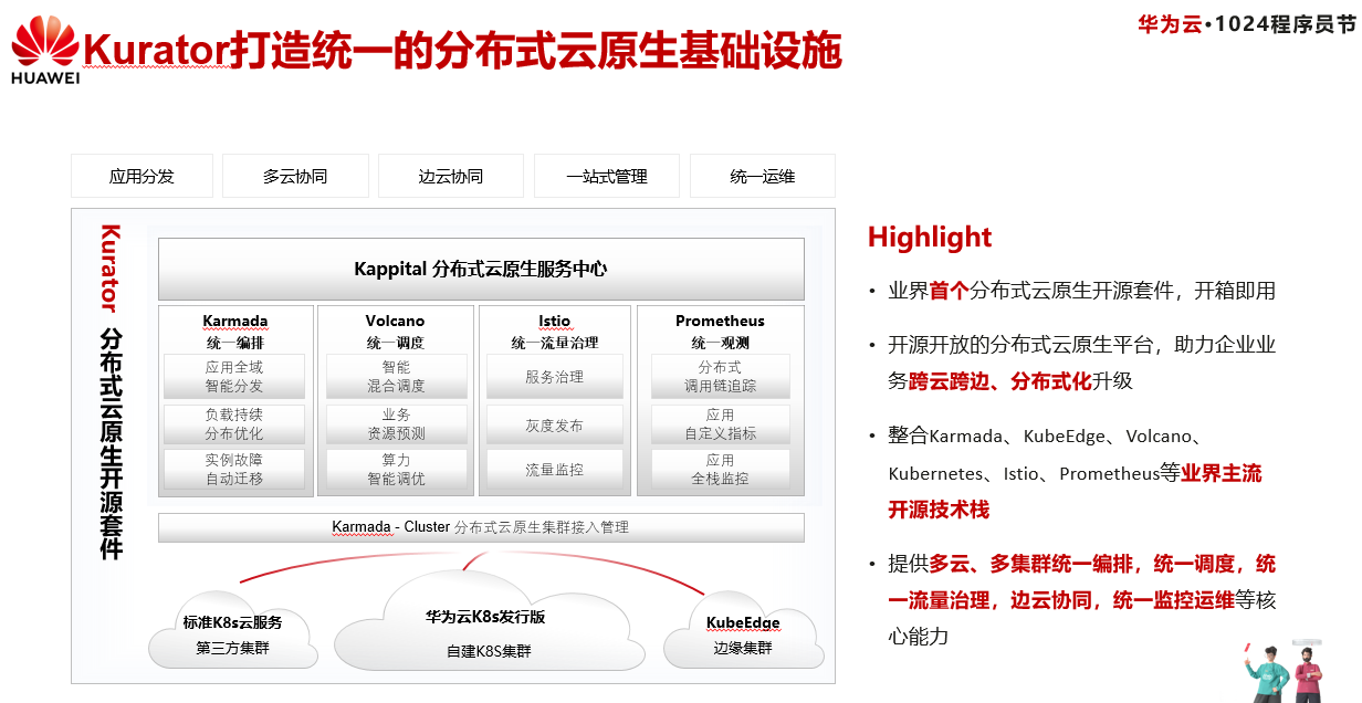 二是基于华为云在分布式云原生领域的多年优秀实践,华为云开源团队构建了开源的分布式云原生套件Kurator,Kurator是业界首个分布式云原生开源套件,整合了Karmada、Istio、Kubeedge、Prometheus等业界主流开源技术栈,同时包括新增的开源分布式云原生服务中心 Kappital。