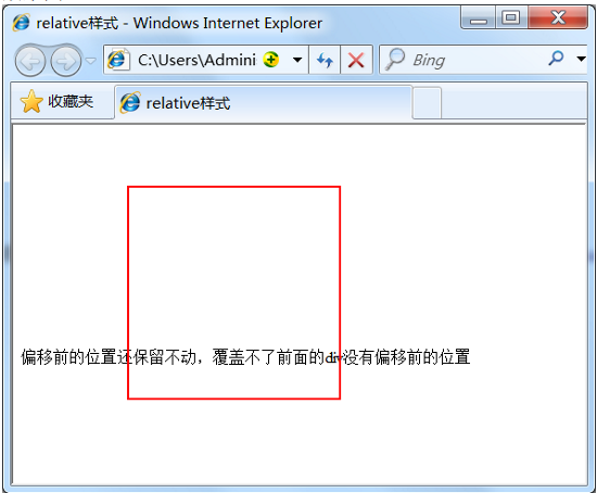 从效果图中可以明显的看出,虽然div元素相对于以前的位置产生了偏移,但是div元素以前的位置还是保留着,所以后面的span元素是显示在了div元素以前位置的后面。