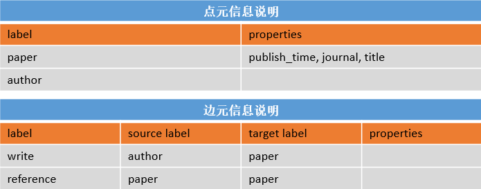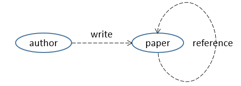 图模型中包含了两类点,分别是 paper 和 author,也包含了两类边,分别是 write 和 reference,下面的表格说明了它们的详细情况。
