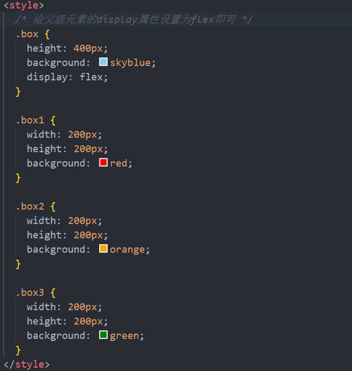 三个块元素设置大小以及背景色,在父容器中添加flex。