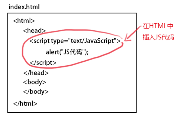 通过前面知识学习,我们知道使用<script>标签在HTML文件中添加JavaScript代码,如图: