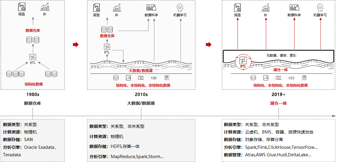 综上所述,现代数据平台的能力不断迭代,滚动向前,一方面是得益于时代背景下,各企事业单位更加重视数据的价值;另一方面数据已在各行业数字化浪潮中,发挥重要价值。大数据在近年来即解决了海量数据的存储、计算问题,还进一步深度解决了时效性差的问题,数据无法跨域融合使用的问题。业界对于数据在一个现代数据平台内流动,加速已是主流趋势,湖仓一体架构已经兼具数据湖的多样性全量数据承载和数据仓库的事务性优势,成为主流架构。