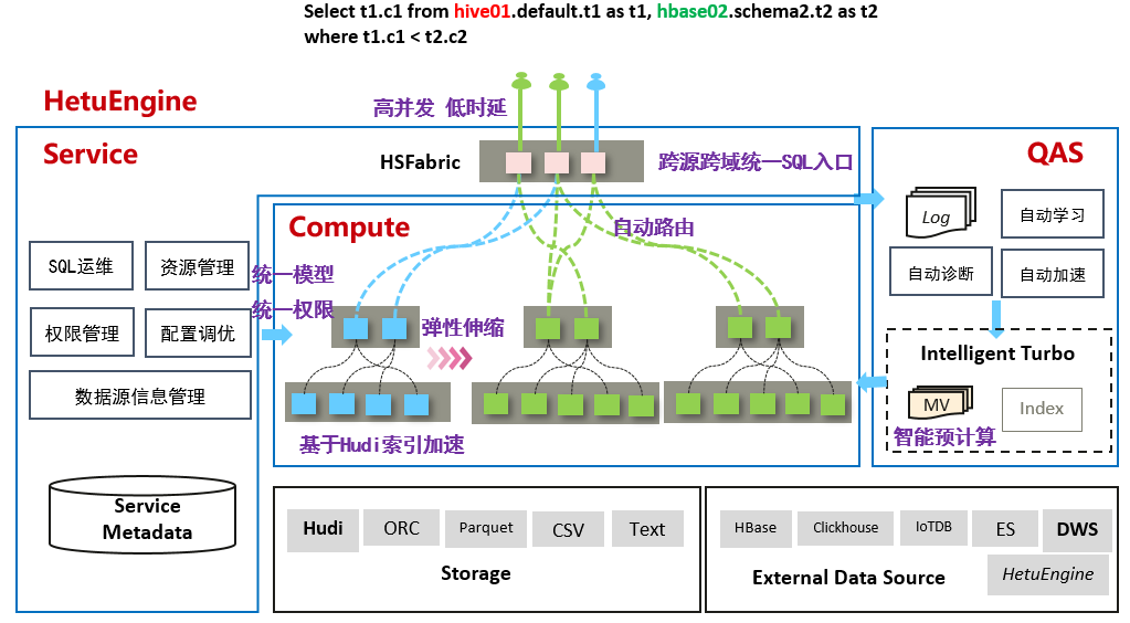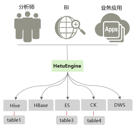 在解决了“入口”的问题后,我们着手构筑起面向现代数据平台的新一代数据分析服务——HetuEngine是华为自研高性能交互式SQL分析及数据虚拟化引擎。与大数据生态无缝融合,实现海量数据秒级交互式查询;支持跨源跨域统一访问,使能数据湖内、湖间、湖仓一站式SQL融合分析。