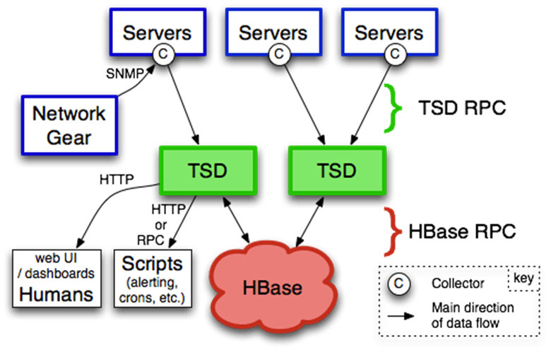 随着大数据技术的兴起,以KV数据库为代表的NoSQL数据库大量涌现,打破了关系数据库ACID的严格限制,以CAP作为约束,底层以大数据分布式文件系统为存储引擎,突破了传统关系数据库面对海量数据存储的局限。其中,HBase是NoSQL数据库的典型代表,具备海量数量的灵活扩展存储能力。时序数据库OpenTSDB基于HBase的这种能力,专门针对时序数据的海量存储和查询做了扩展。OpenTSDB的整体架构如下所示,由运行在HBase之上的一个或者多个时间序列守护程序TSD (Time Series Daemon) 组成,每个TSDB都是无状态的独立节点,因此可以根据系统负载情况进行任意节点的横向扩展: