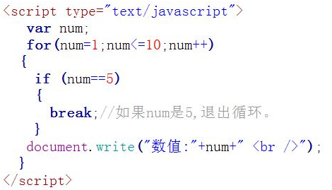 在while、for、do...while、while循环中使用break语句退出当前循环,直接执行后面的代码。