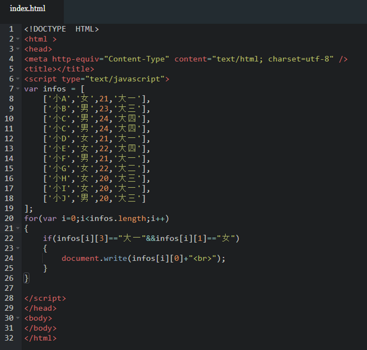 在一个大学的编程选修课班里,我们得到了一组参加该班级的学生数据,分别是姓名、性别、年龄和年级,接下来呢,我们要利用JavaScript的知识挑出其中所有是大一的女生的的名字哦。