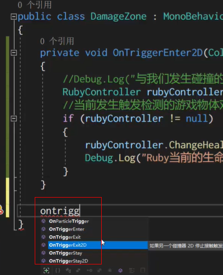 【摘要】 Enemy开发添加触发器需要把box collider 2d的is trigger打上勾创建并编写脚本Ctr+k+f自动对齐代码挂载脚本到sprite涉及到的API涉及到的代码