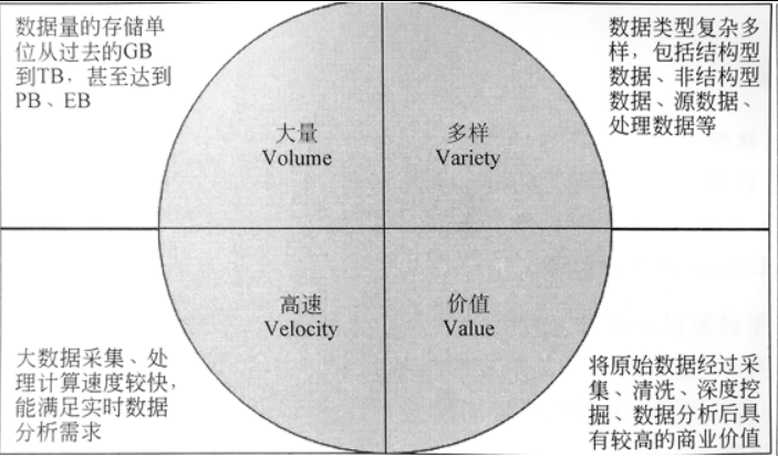 一般认为,大数据主要具有以下4个方面的典型特征,即大量(Volume)、多样(Variety)、高速(Velocity)和价值(Value),即所谓的4V,接下来,通过一张图来具休描述。