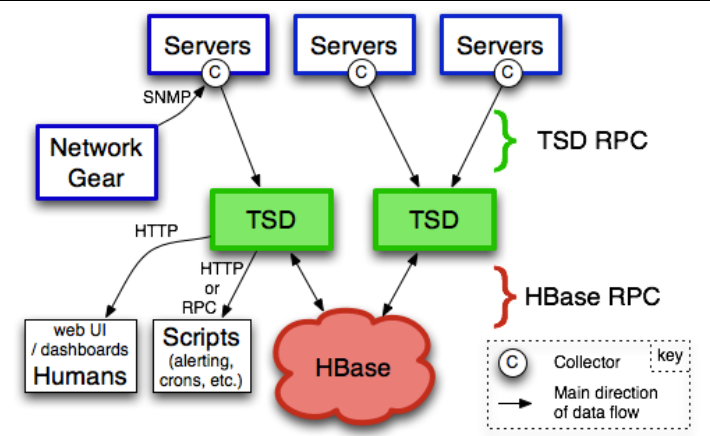 Servers指服务器,上面的C是指Collector,可以理解为OpenTSDB的agent,通过Collector收集数据,推送数据。