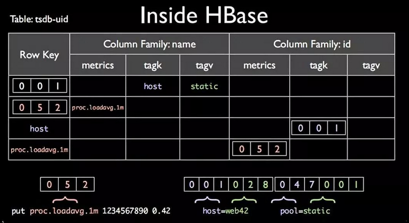 tsdb-uid中保存的是metric,tagk,tagv的一些映射关系,意在缩短rowkey的长度。