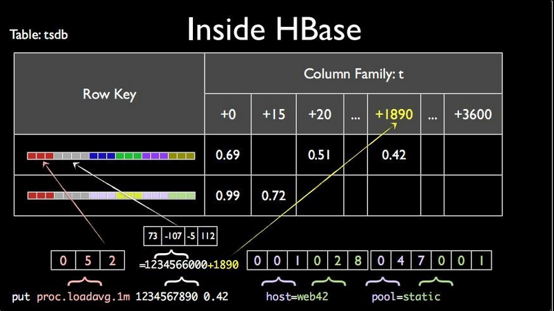 tsdb表包含一个列族“t”,在HBase中列族名字越短,所占用的字节数也就越短,越有利于存储。