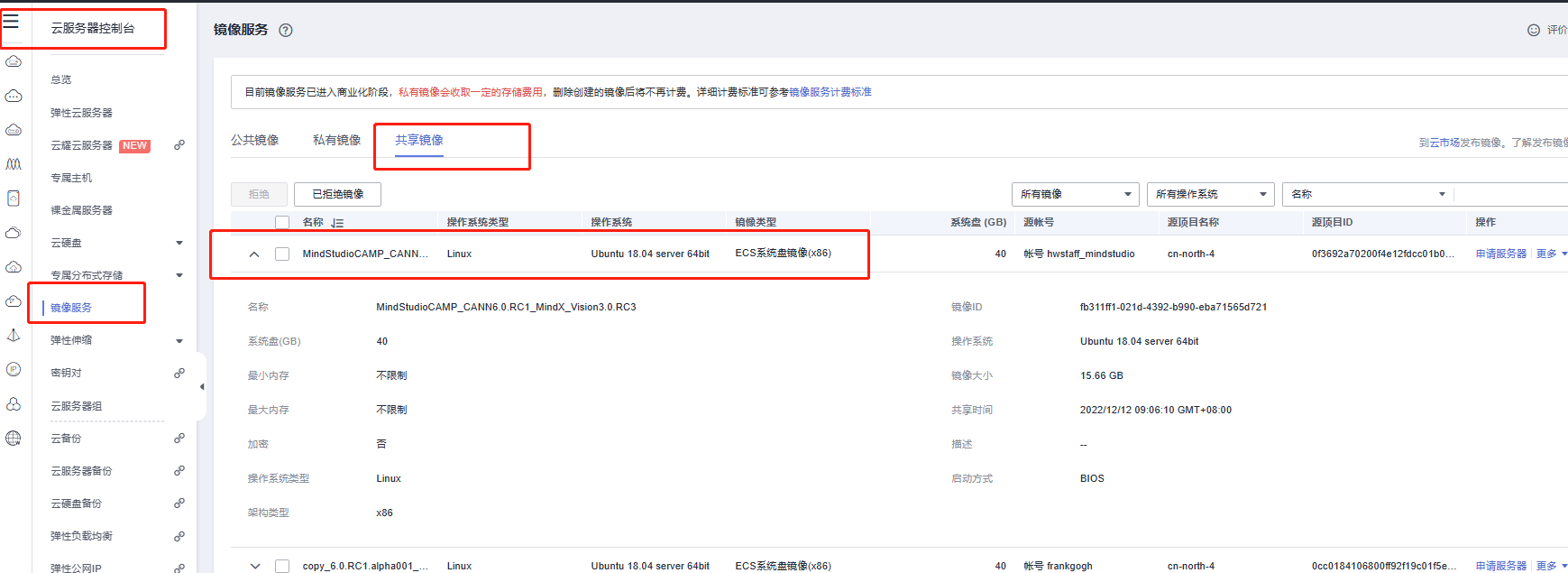 在左侧菜单栏中选择“镜像服务”--“共享镜像”