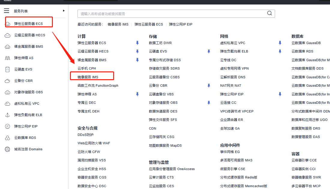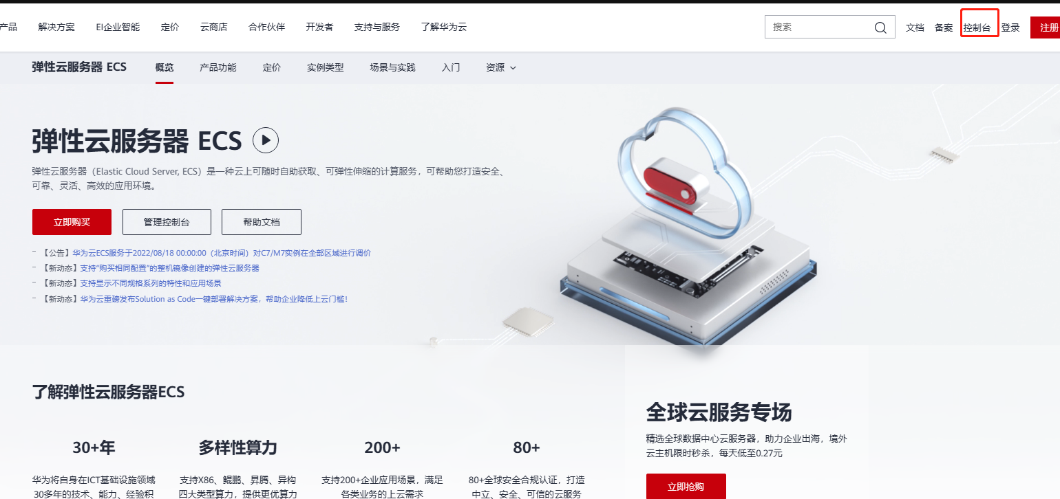 在华为云ECS主页 ,点击“控制台”进入ECS的管理页面。