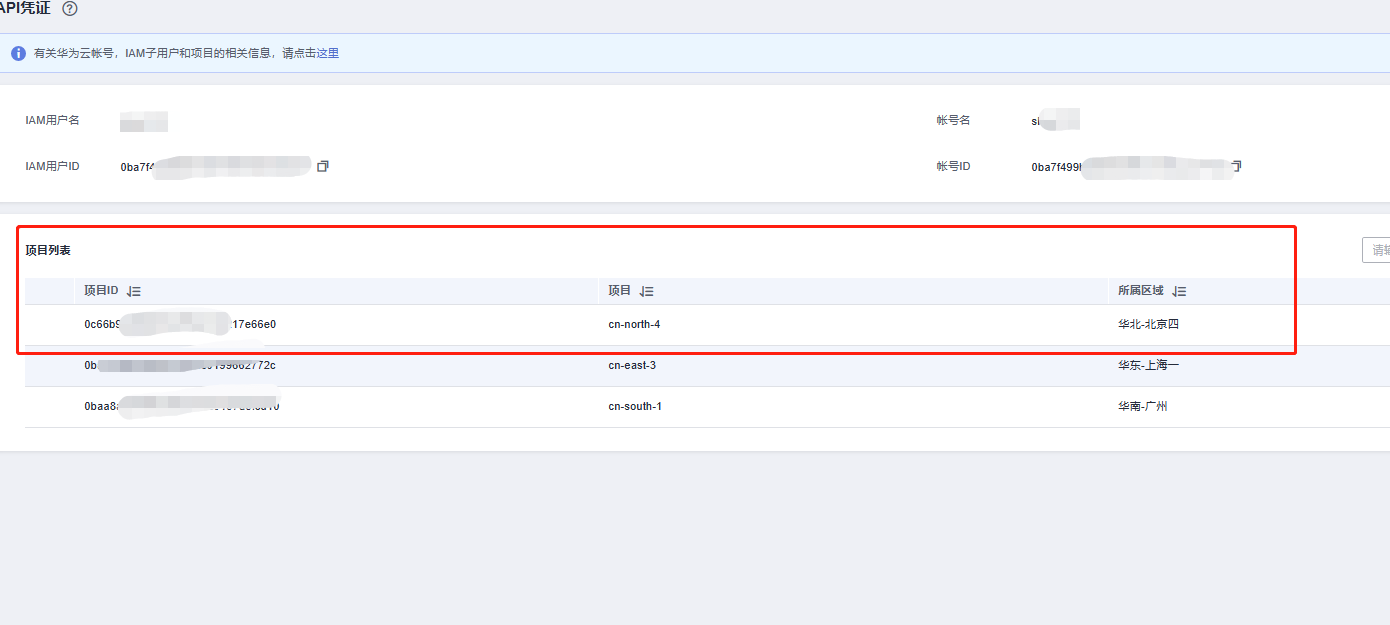本节指导如何获取华为云账号下项目ID,以便方便导入实验所需镜像。
