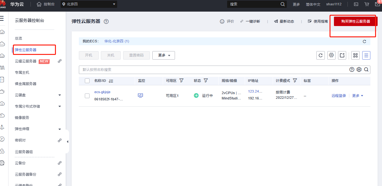 控制台区域选择“华北-北京四”,在左侧菜单栏中选择“弹性云服务器”,在右上角“购买弹性云服务器”。