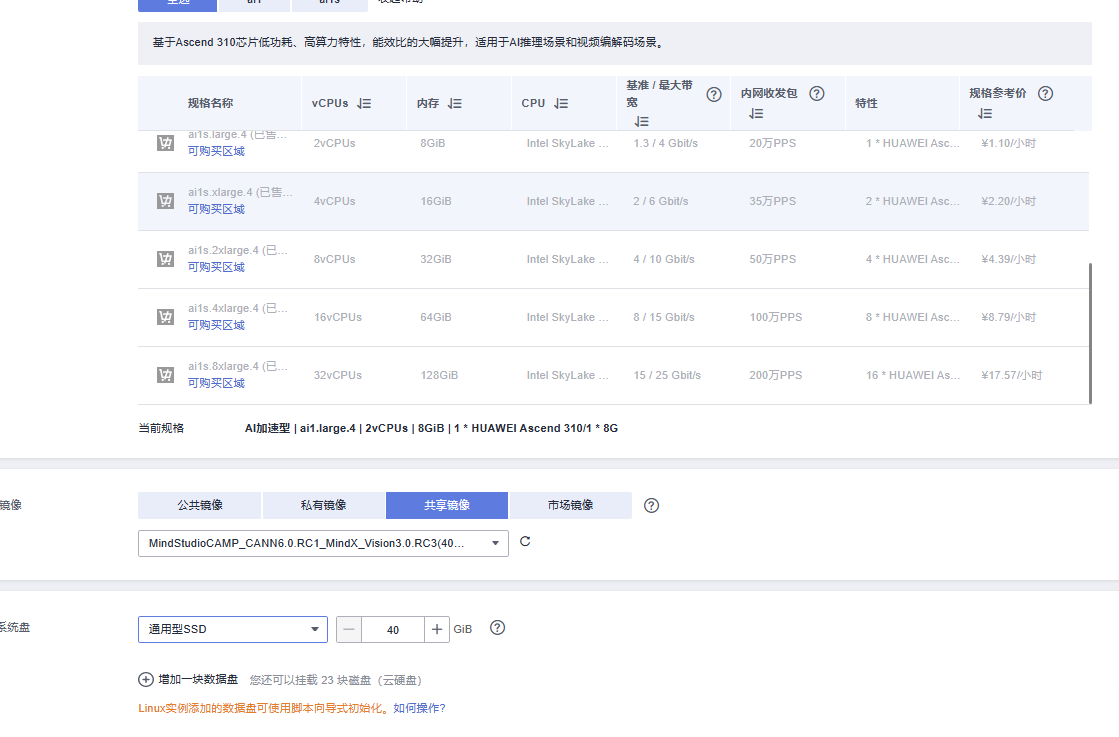 • 规格:AI加速型 | ai1.large.4 | 2vCPUs | 8GiB | 1 * HUAWEI Ascend 310/1 * 8G。