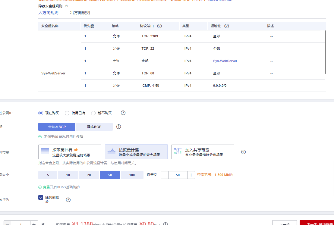 • 宽带大小:自定义,50Mbit/s。