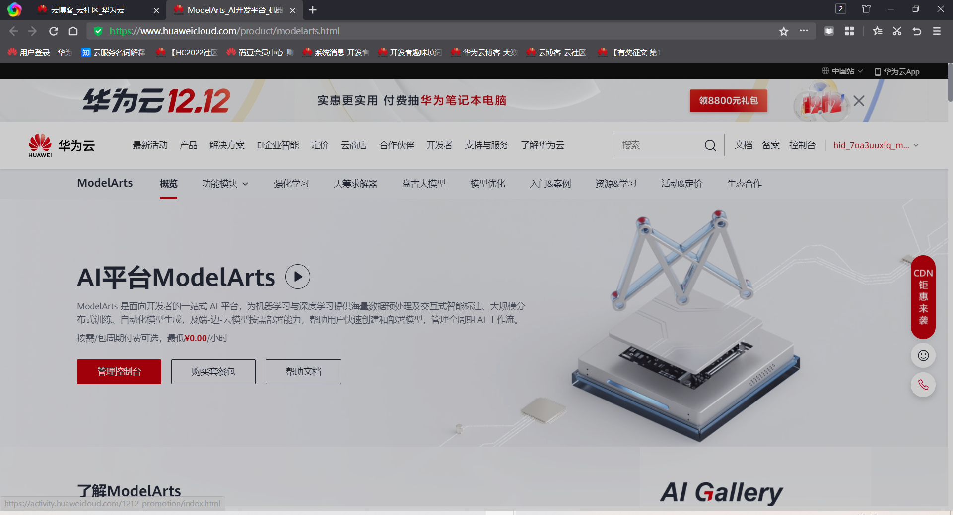 首先要做的是订阅 Model Arts 中对应的模型,我们访问其首页:https://www.huaweicloud.cn/product/modelarts.html