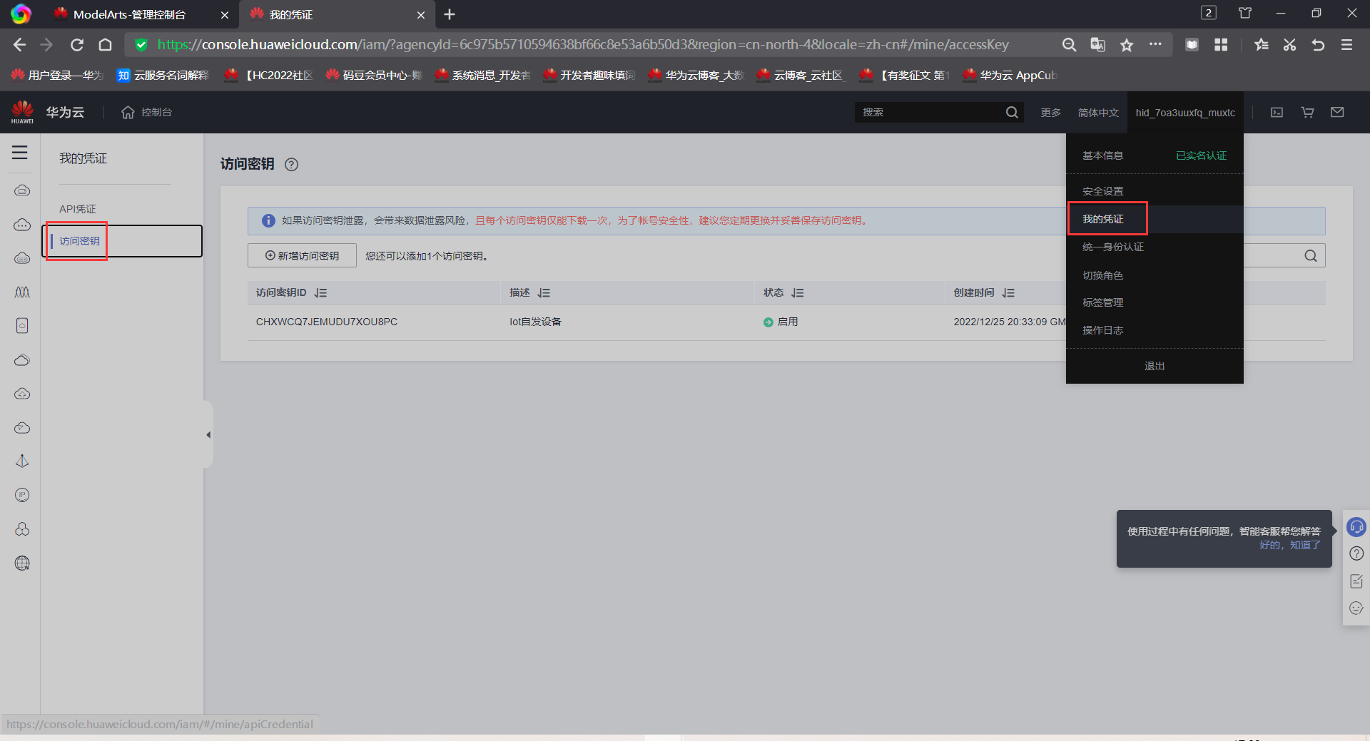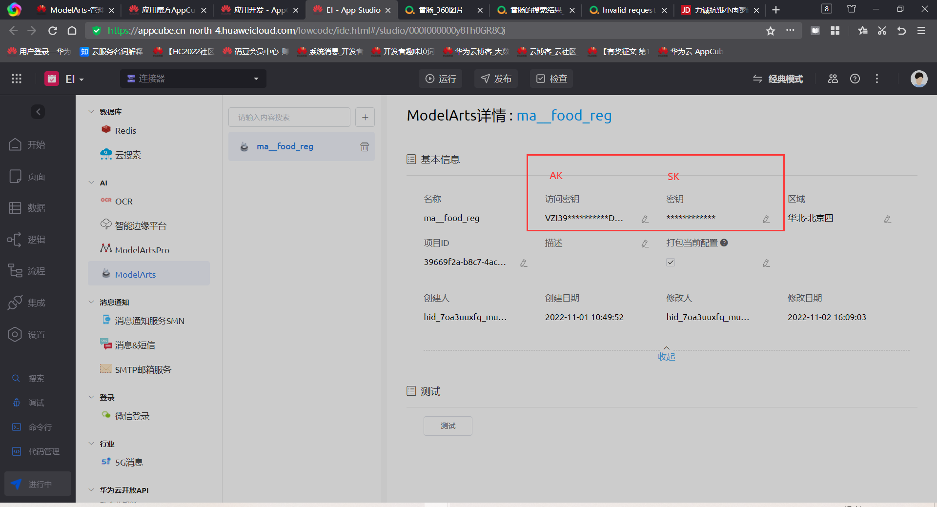 接着在左侧列表选择“ModelArts”,然后修改“访问密钥AK”和“密钥SK”(这个在之前的“访问凭证”那边已经下载过了,在credentials.csv文件中)