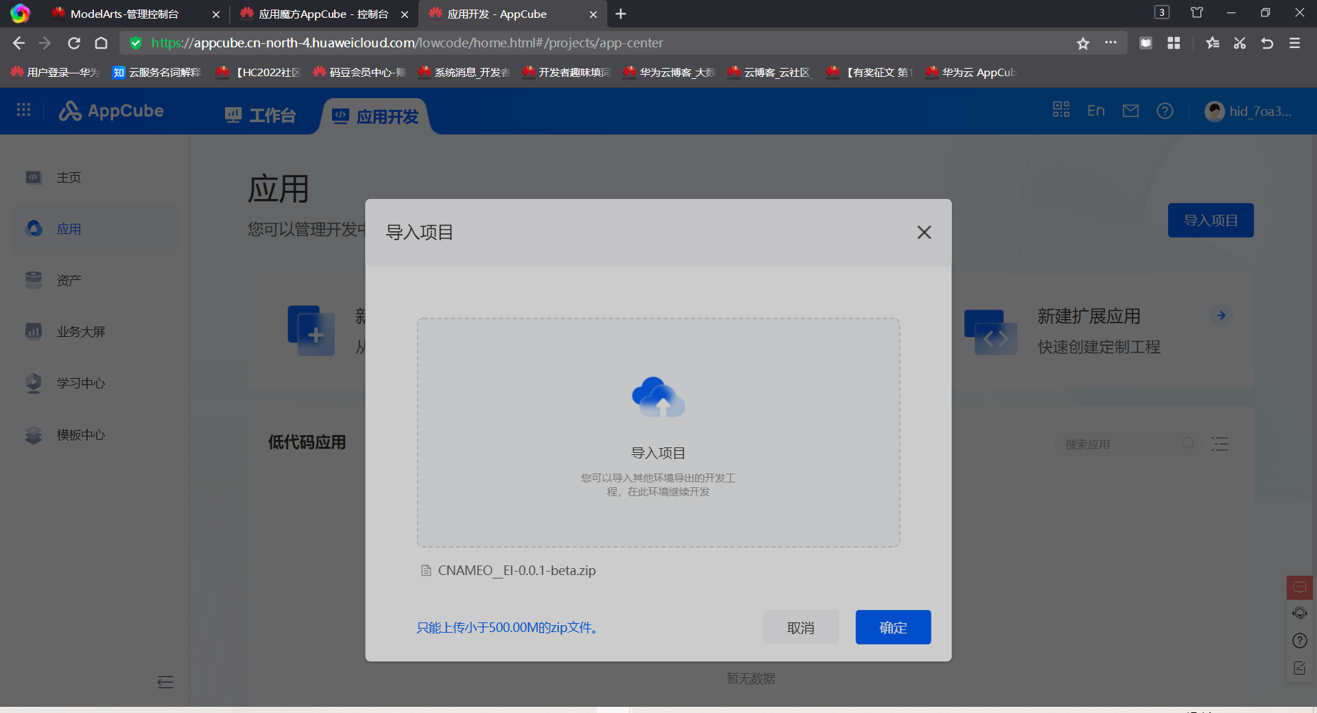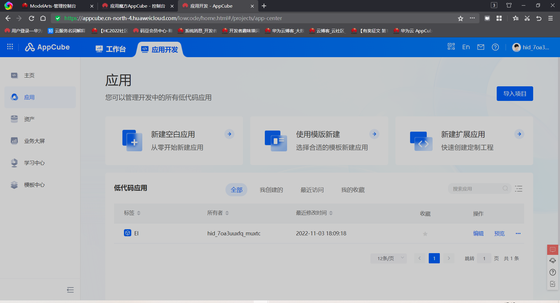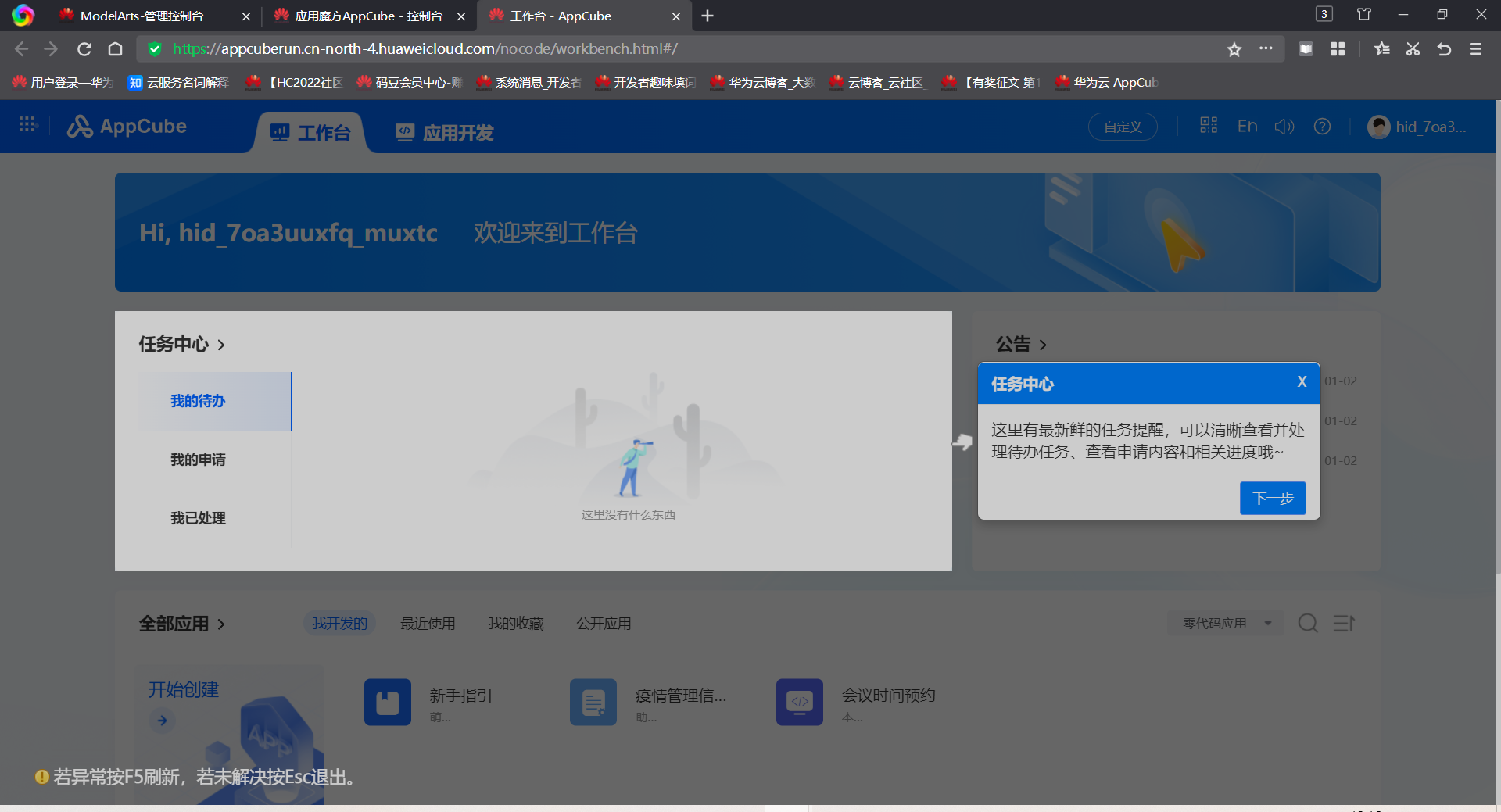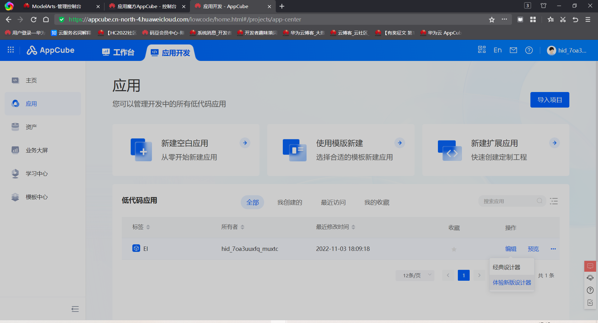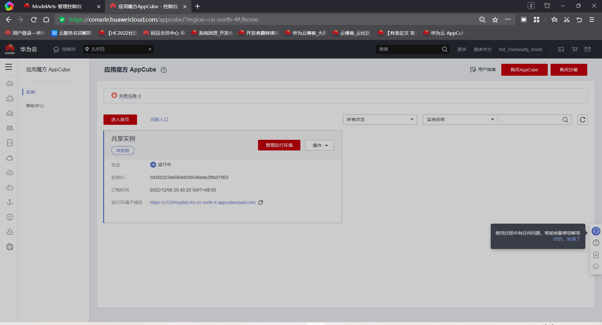 首先,来到AppCube首页:https://console.huaweicloud.cn/appcube/?region=cn-north-4#/home