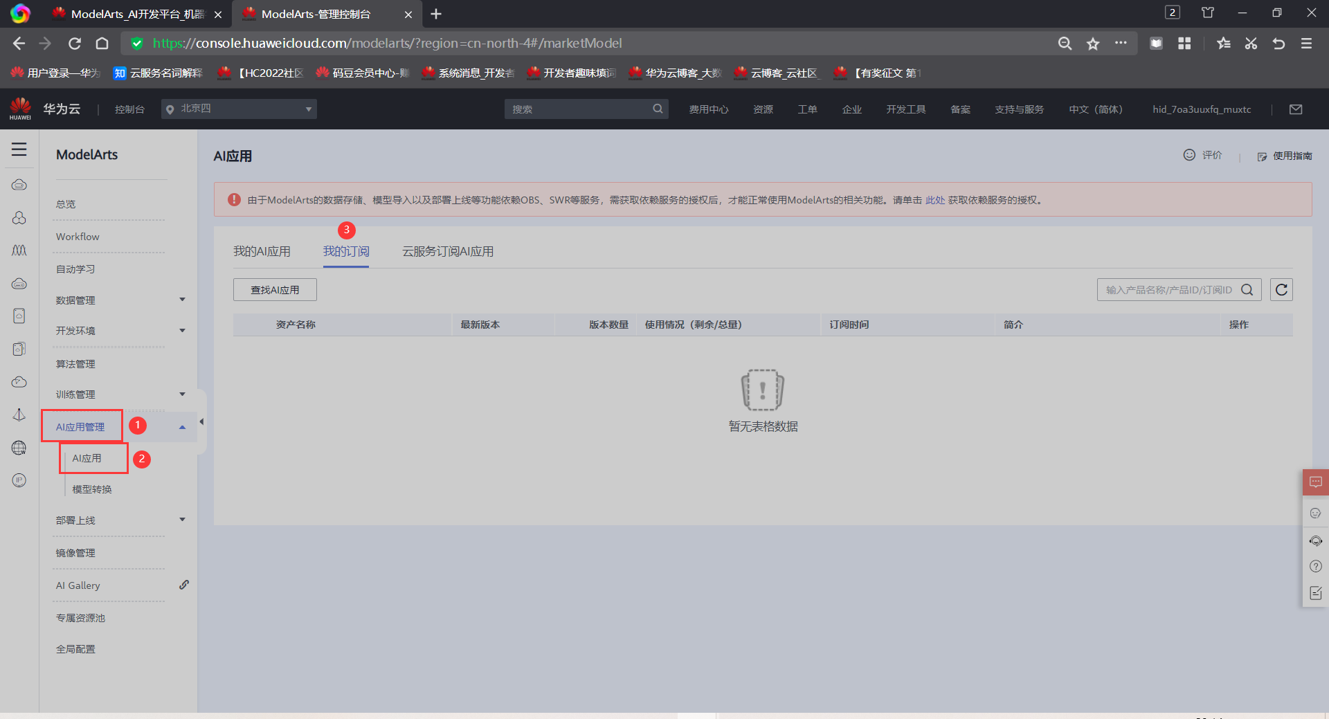 订阅后,即可前往控制台,云服务区域选择“华北-北京四”