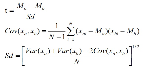式中Ma和Mb是样本A和样本B的平均值,N是样本A和样本B的配对个数,Var(xa)和Var(xb)是样本A和样本B的方差。(xai,xbi),i=1,2,…N,是N个配对样本。