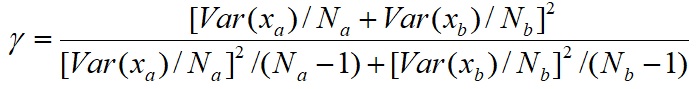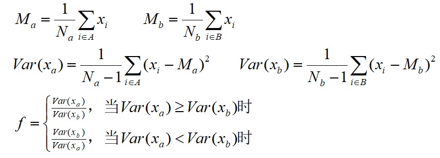 设A和B两组样本,其样本个数分别为Na和Nb,对应的平均值为Ma和Mb,对应的方差为Var(xa)和Var(xb),那么统计量f符合F分布,