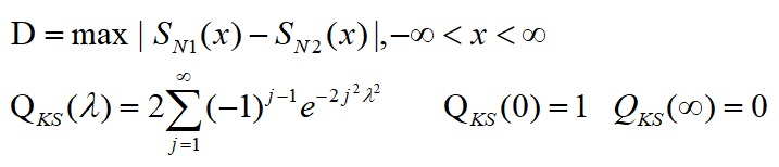 设SN1(x)和SN2(x)是两组样本数据的累计频数分布函数,是单调上升函数。K-S统计量为:
