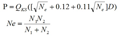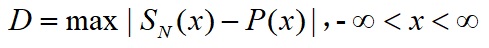 当检验一组样本是否来自某已知分布(如正态分布)时,Ne=N(样本个数),此时SN1(x)是样本累计分布(N=N1),SN2(x)为已知分布函数P(x),统计量D为: