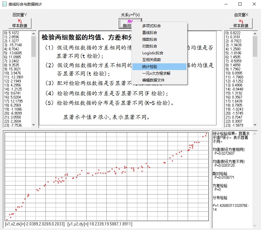 选择其中《曲线拟合》,出现软件界面并选择《统计检验》,对左右两边的数据进行检验。
