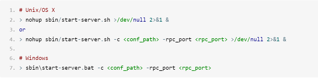 # Unix/OS X> nohup sbin/start-server.sh >/dev/null 2>&1 &or> nohup sbin/start-server.sh -c <conf_path> -rpc_port <rpc_port> >/dev/null 2>&1 &# Windows> sbin\start-server.bat -c <conf_path> -rpc_port <rpc_port>
