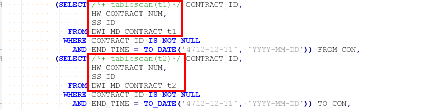 4) 找到原始SQL语句,对查询语句中出现的表dwimd.dwi_md_contract 进行hint,强制其走顺序扫描,避免走indexscan(全量语句见附件)