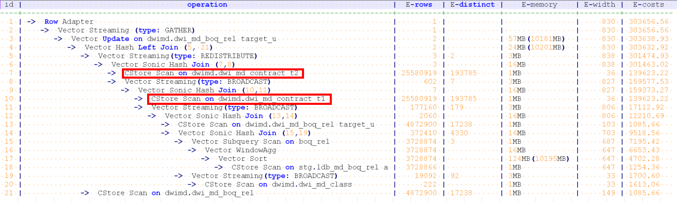 5)对语句进行explain verbose,查看计划,发现计划符合预期(即表dwimd.dwi_md_contract走tablescan,对于列存表计划上显式为CStore Scan)