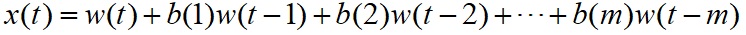 设MA模型的阶数为m(记为MA(m)),w(t)是零均值高斯白噪声序列,则时间序列x(t)的滑动平均(MA)模型定义为: