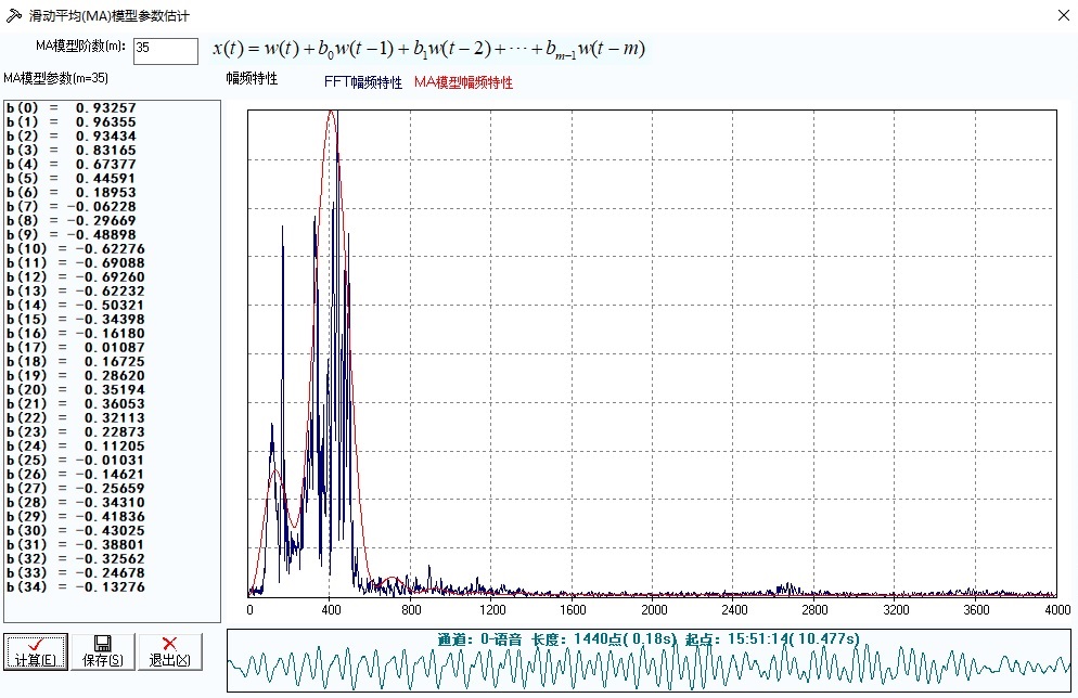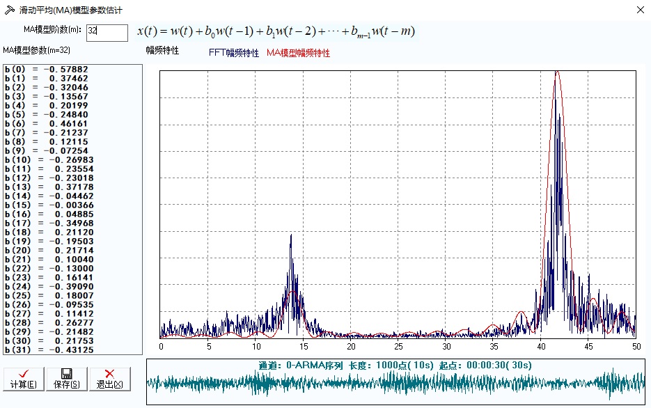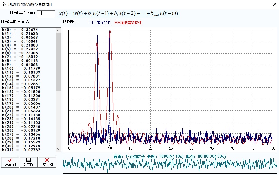 在对话框中输入合适的MA模型阶数m,回车或者点击 “计算”按钮,可以重新按照新的阶数估计MA模型参数,并计算MA模型估计的功率谱(红色曲线),并与之对照绘制出用周期图法估计的功率谱(蓝色曲线)。左边的列表框里显示模型参数,可通过点击“保存”按钮将参数保存到指定的文件之中。这里MA模型阶次取值范围是[1,256]之间的整数。