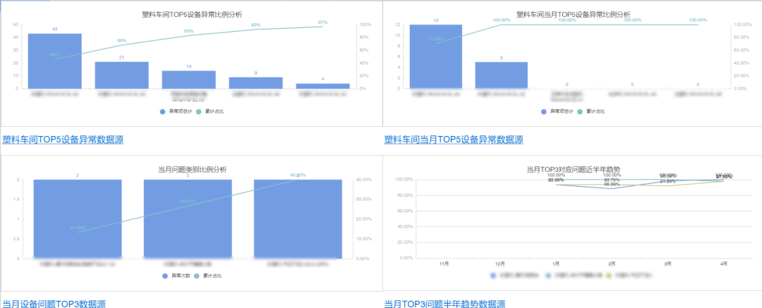 点检结果通过表单提交后可「一键生成关联表格」,表格数据可通过「可视化图表」来做进一步的呈现,可视化的汇报形式让管理者可以清晰直观地了解到生产数据的重点,迅速掌握生产情况,发现异常问题所在。