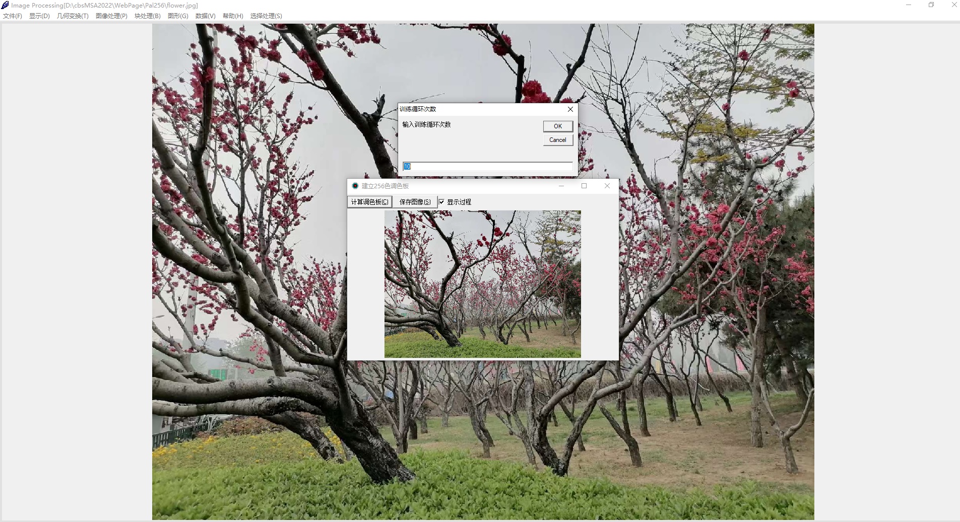 点击其中“图像处理”按钮,出现图像处理软件界面,打开要处理的真彩色图像,选择菜单:《图像处理》《创建256色调色版》,出现界面: