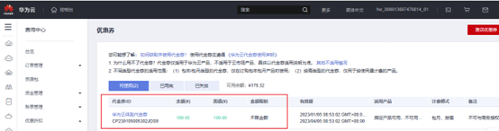 费用中心→优惠折扣→代金券,确认代金券已经下发