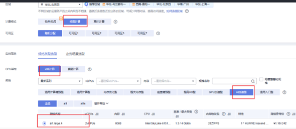 选择按需计费,CPU架构选择x86,规格选择AI加速型,选择ai1s.large.4即可,搭载的是Ascend 310芯片