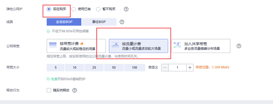 网络选择默认值;选择现在购买;公网选择按流量计费,带宽选择100M